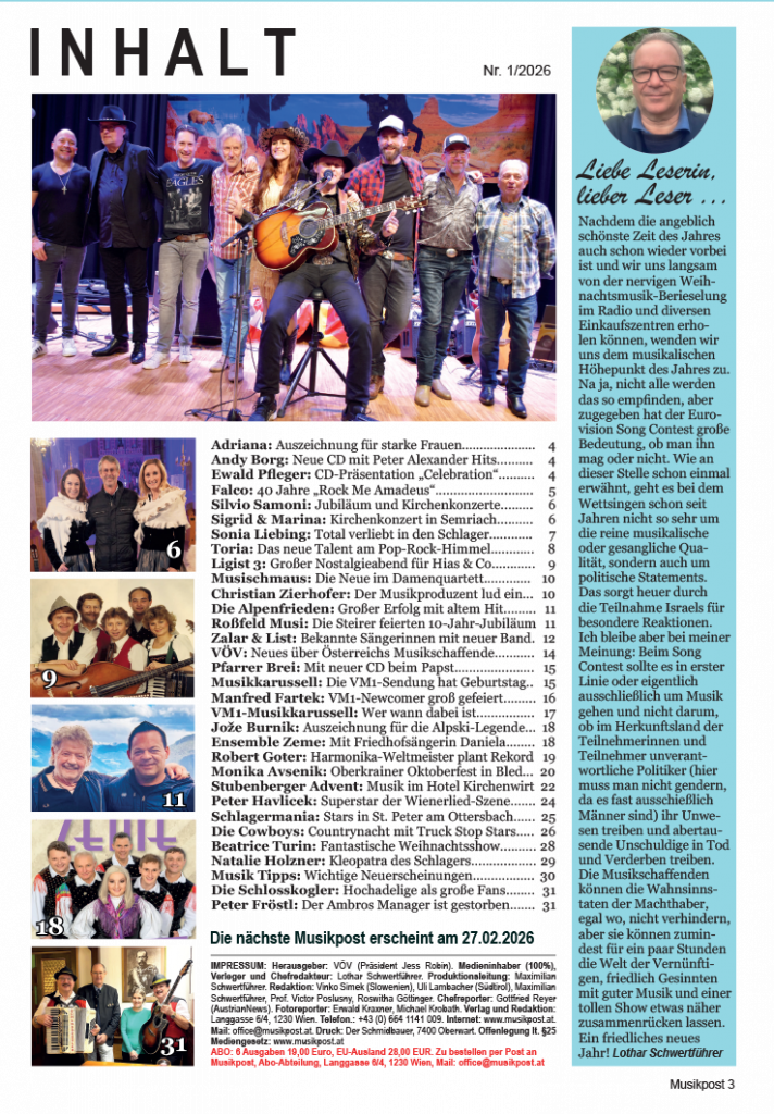 Ab 2. Jänner 2026 ist die neue Musikpost in der Trafik. Das Cover ziert diesmal die deutsche Schlagersängerin Sonia Liebing. Sie macht nicht nur erfolgreich Musik, sondern lässt auch mit interessanten Ansichten zum Thema Schönheits-Operationen aufhorchen.